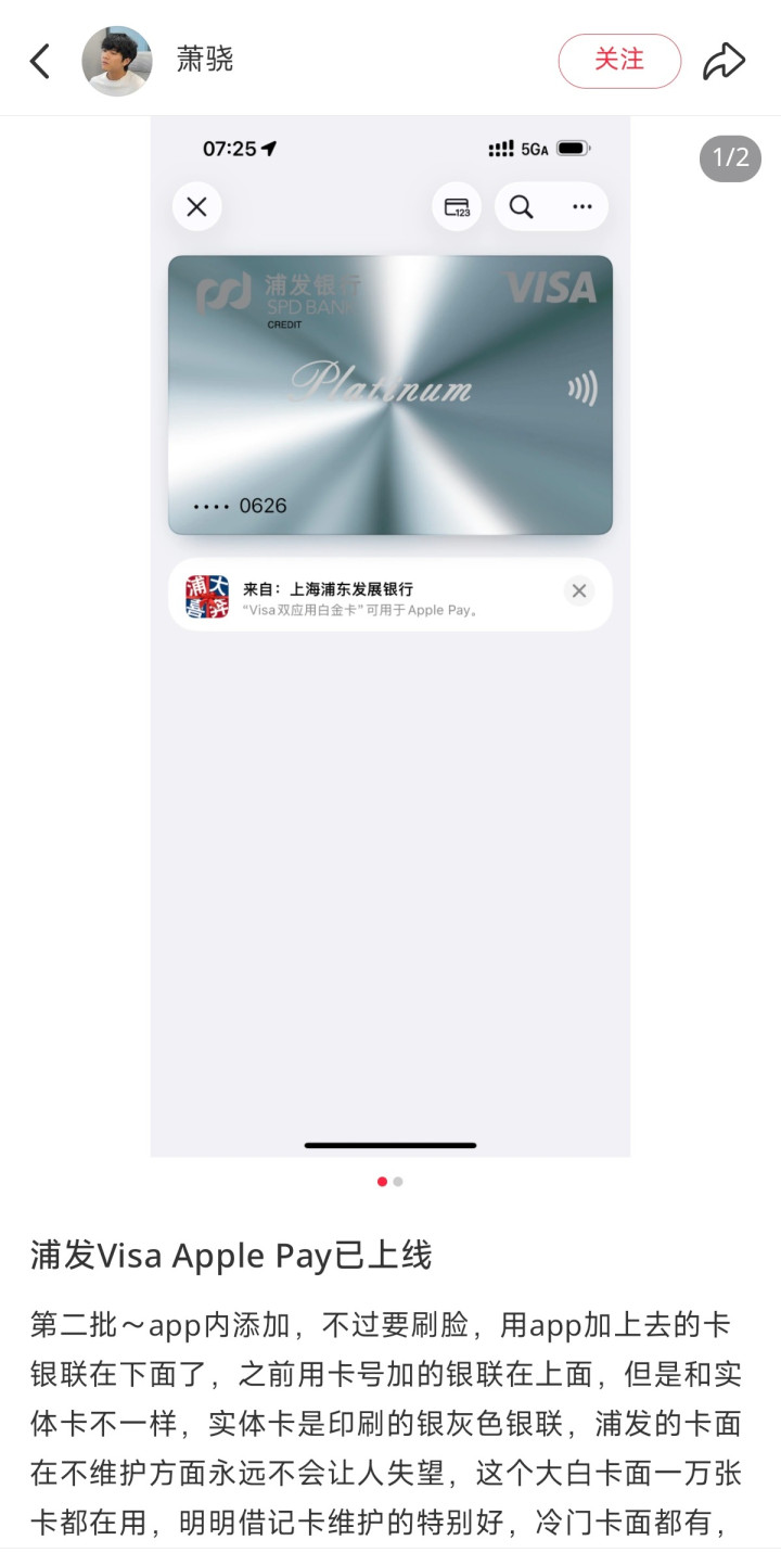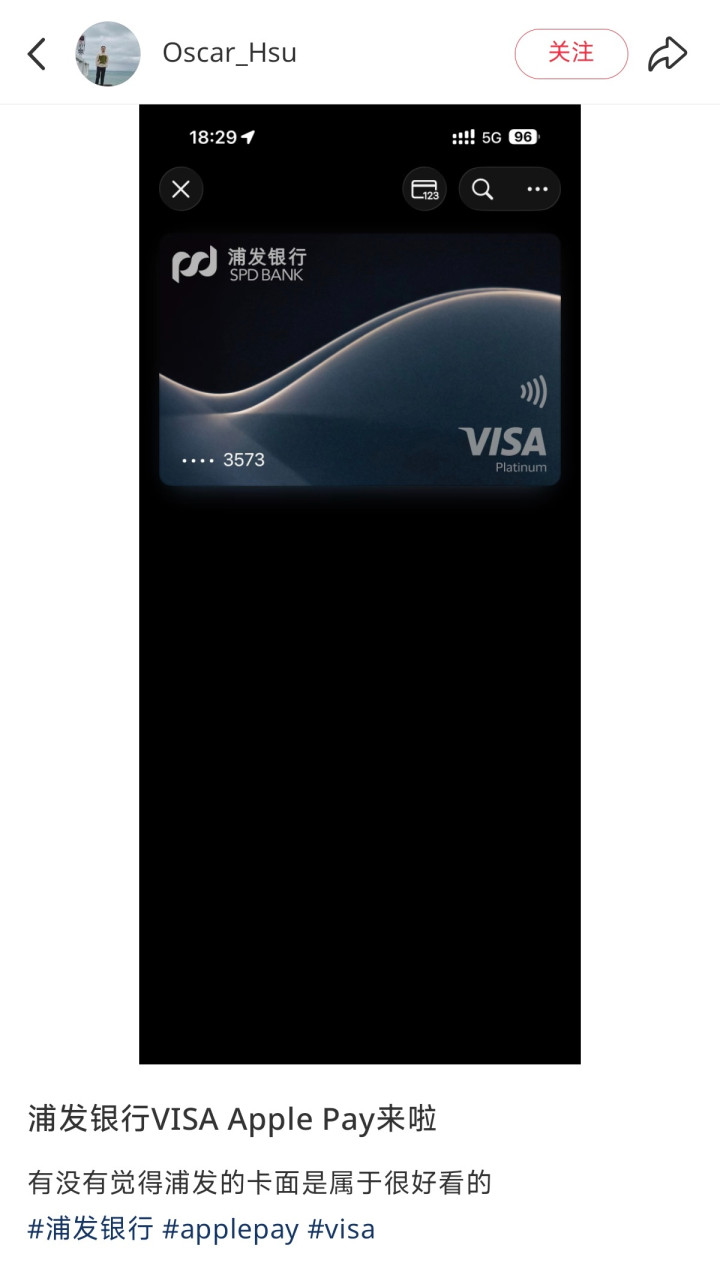 结合小红书用户@萧骁及@Oscar_Hsu发文,浦发银行Visa信用卡目前也可以绑定至ApplePay,只需将浦发银行信用卡App“浦大喜奔”更新至最新版本即可找到绑定入口。