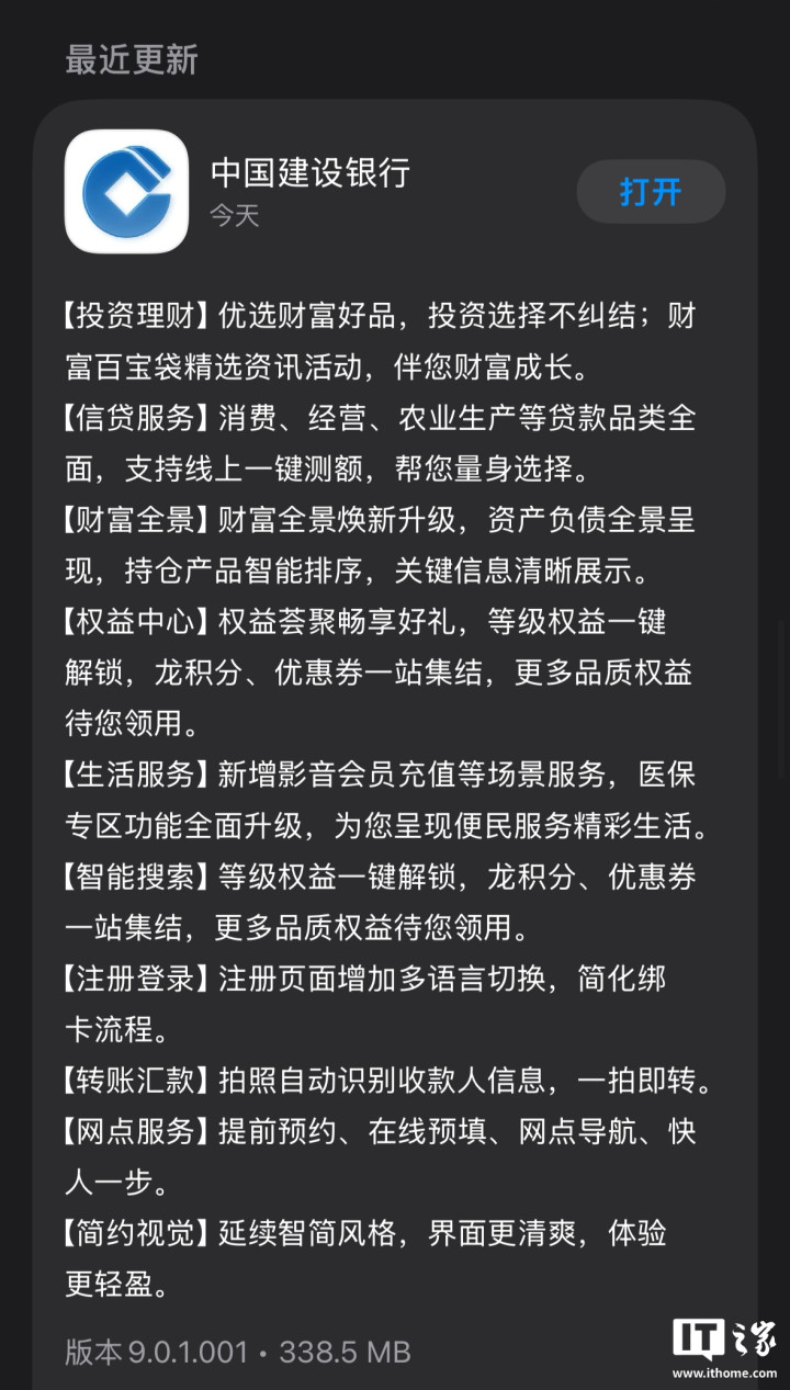 IT之家在iOS26系统实测发现,将“中国建设银行”App更新至9.0.1.001版本后,即可将Visa信用卡绑定至ApplePay。